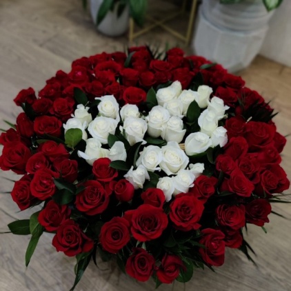 101 роза в корзине . Цветовая гамма может быть любой по вашим пожеланиям.