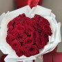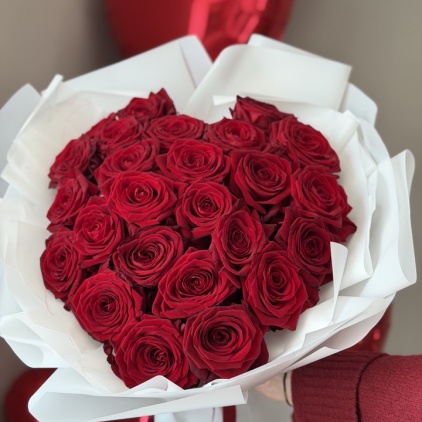 Букет из 25 красных роз в форме сердца — это классический символ страстной любви, нежности и искренней привязанности.